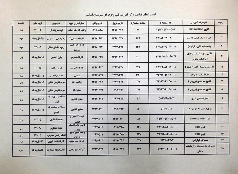 *لیست اوقات فراغت مرکز آموزش فنی و حرفه ای شهرستان اشکذر