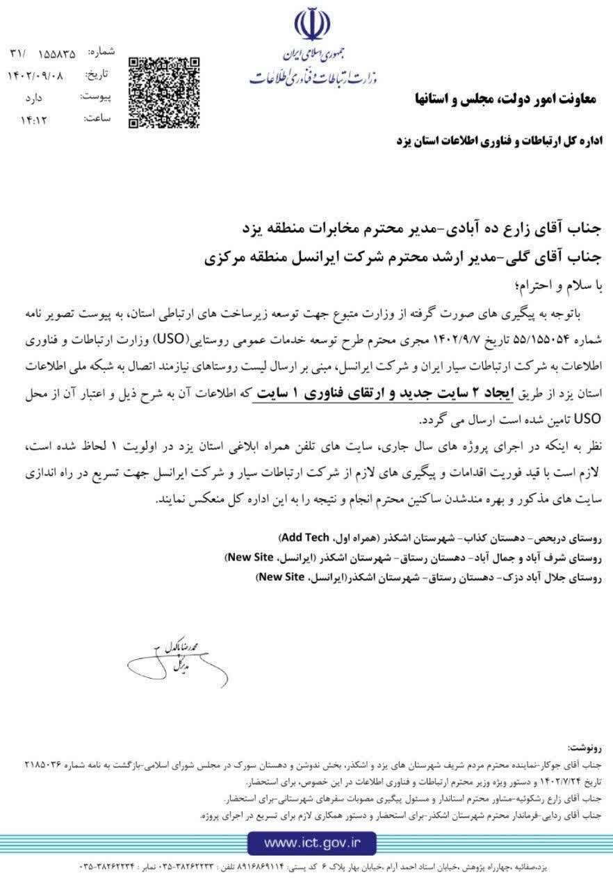 با پیگیری نماینده مردم یزد و اشکذر در مجلس شورای اسلامی تأمین اعتبار مورد نیاز راه اندازی اینترنت پرسرعت همراه در روستاهای محروم اشکذر انجام شد.