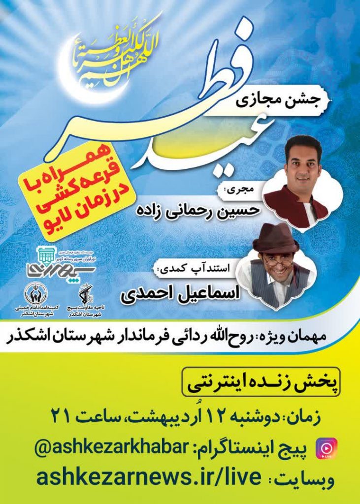 ، پخش زنده اینترنتی جشن مجازی عید فطر همراه با جوایز نفیس امشب از ساعت ۲۱ از طریق وبسایت پایگاه اطلاع رسانی اشکذر خبر و پیج اینستاگرام اشکذرخبر قابل مشاهده است.