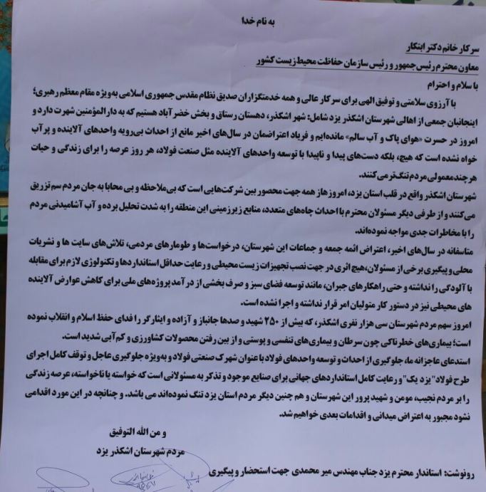 گفتنی است، مردم اشکذر بارها مخالفت خود را در مورد استقرار صنایع آلاینده در این شهرستان از طریق نوشتن طومار ، تشکیل پویش خودجوش مردمی #نه_به_فولاد_یزد_یک و همچنین تجمع بانوان مقابل درب فرمانداری نشان دادند ولی دریغ از خبری خوش از طرف مسئولان برای مردم این شهرستان.