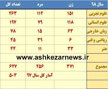 وی افزود: از مجموع 627 نفر شرکتکننده، 371 نفر زن و 256 نفر مرد بودند که 263 داوطلب در رشته علوم تجربی، 197 داوطلب در رشته علوم انسانی، 78 داوطلب در رشته زبان خارجی، 45 داوطلب در رشته ریاضی و فنی و 44 داوطلب در رشته هنر باهم به رقابت پرداختند.